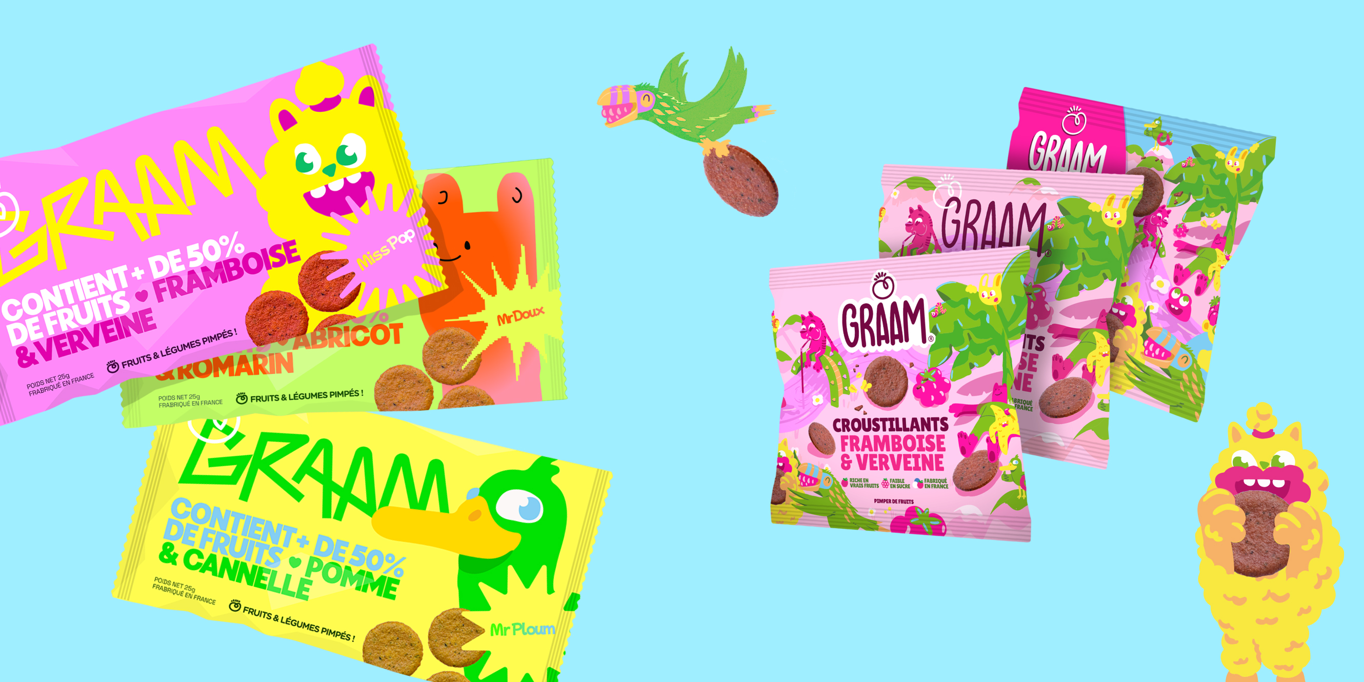 Le projet explore la construction d’un univers coloré et expressif : personnages, palettes, motifs, typographies et mises en scène se déclinent sur des packagings, des supports digitaux et des objets du quotidien.